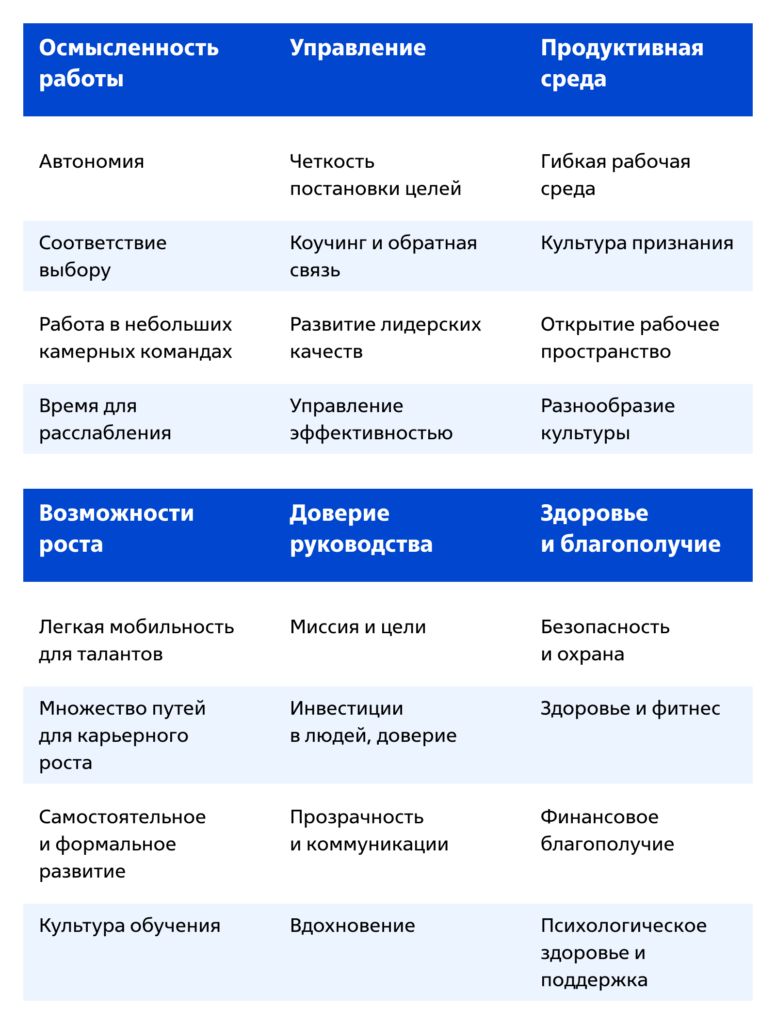 Эта таблица — ориентир. На деле необходимо учитывать гораздо больше критериев, важна каждая мелочь: от уровня шума в офисе и освещении до количества писем, на которые приходится отвечать в течение дня. Лучшее, что может сделать руководитель — начать диалог с сотрудниками. Ещё лучше — предложить решение проблем и приступить к действиям.