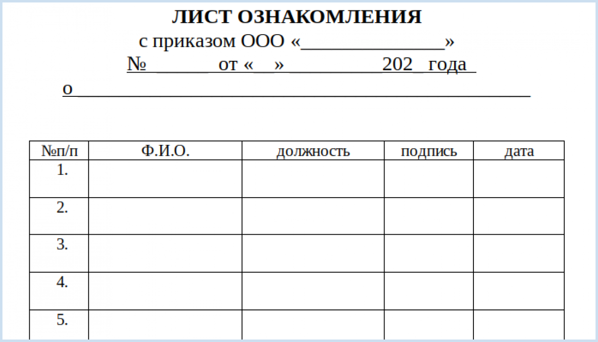 Если документ касается всех или нескольких сотрудников, его размещают в общем доступе, например, на стенде. Подпись об ознакомлении можно получить через лист ознакомления — это список с подписями сотрудников, подтверждающий, что они прочитали документ.