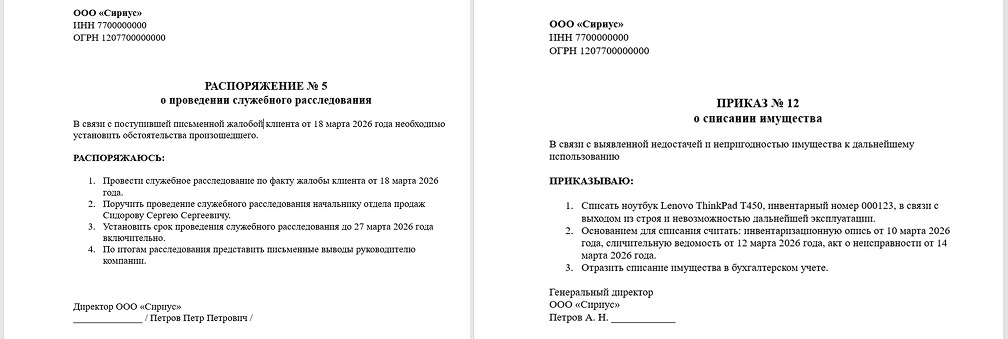 Приказ и распоряжение готовят по одной и той же схеме. Разница только в том, что вы оформляете: новый порядок работы или конкретное указание. Наша инструкция поможет подготовить документ, который подходит для малого бизнеса.