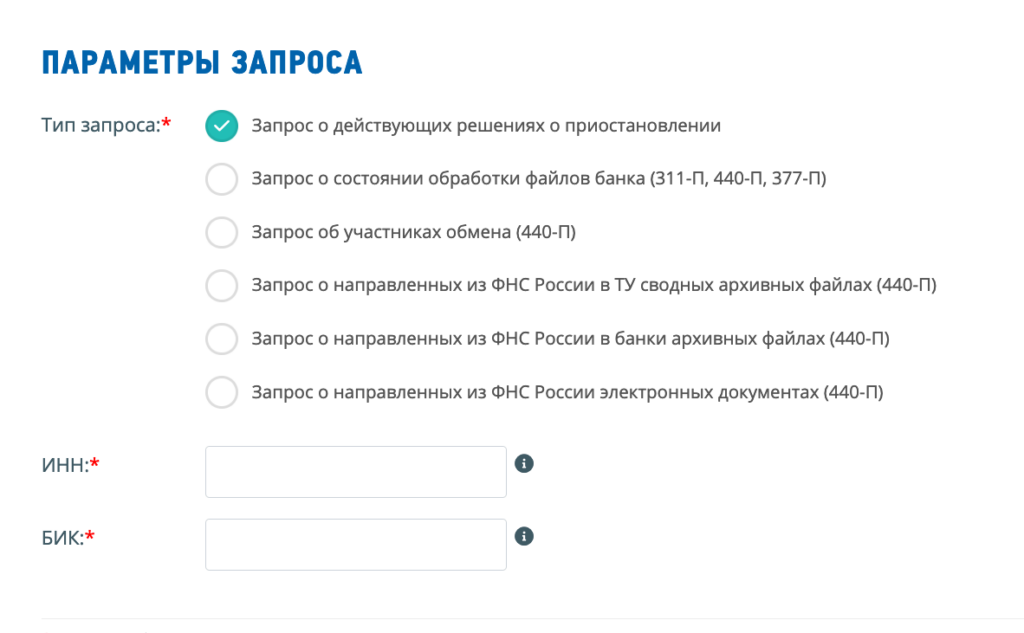 Перейти в сервис ФНС «Банкинформ» → Выбрать тип запроса → Ввести ИНН плательщика и БИК банка, выполняющего запрос.