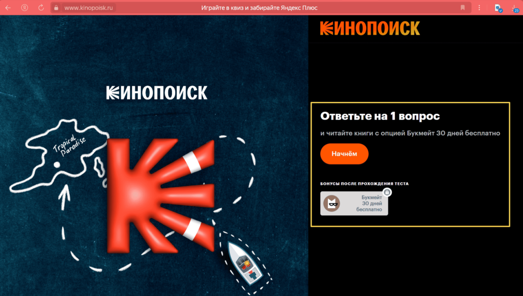 Онлайн-кинотеатр хочет увеличить количество пользователей за счёт бесплатного пробного периода. Конечная цель кампании — увеличение количества платных подписчиков. Поэтому онлайн-кинотеатр разместил CTA на весь экран на главной странице сайта. Чтобы измерить эффективность кнопки «Начать пробный период», нужно измерить настроить ссылки и аналитики в Яндекс.Метрике, затем отслеживать количество активированных пробных периодов, потом измерить конверсию перехода из пробного периода в платный. Если бы целью кампании было увеличение охвата, то главным критерием эффективности CTA могли быть клики по кнопке. Как мы видим, проверка эффективности CTA здесь оценивается с учётом воронки продаж и целей маркетинга.