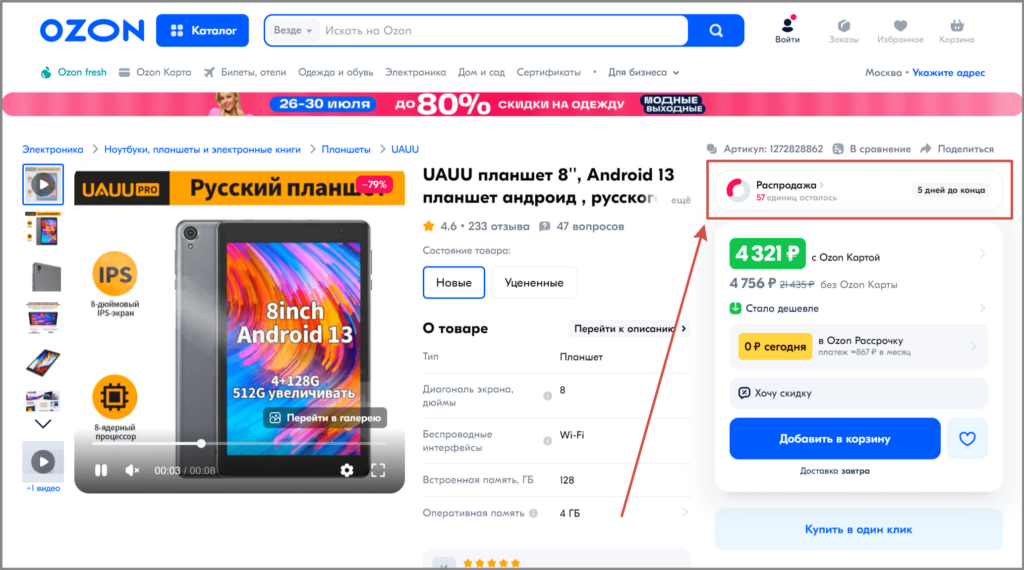 Помимо кнопки «Добавить товар», можно разместить счётчик, показывающий, сколько осталось времени до завершения акции, особенно если товар востребованный, и на него действует большая скидка.