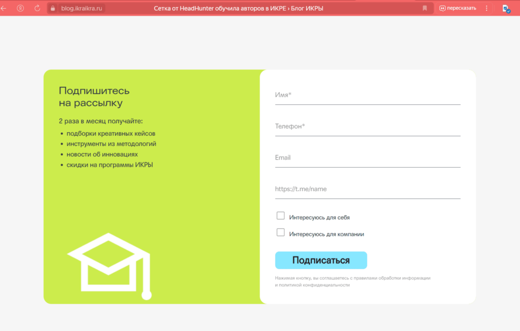 Если цель страницы — привлечь новых подписчиков и собрать сообщество, то кнопка с просьбой подписаться на ваши соцсети или телеграм-канал будет отличным призывом к действию.