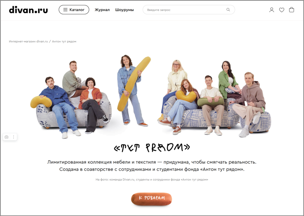 Одна из самых известных НКО, с которой выпустили свои коллаборации многие бренды, — это благотворительный фонд «Антон тут рядом». Например, крупный производитель мебели Divan.ru сделал лимитированную коллекцию мебели и текстиля, а екатеринбургский магазин «Ель» продавал линейку одежды с цитатами от подопечных фонда.