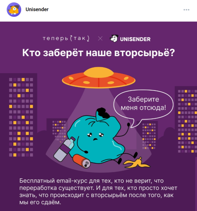 Бюро партнёрств и коммуникаций «Теперь так» вместе с сервисом рассылок Unisender и другими компаниями выпустили мини-курс про бережное потребление и сортировку мусора.