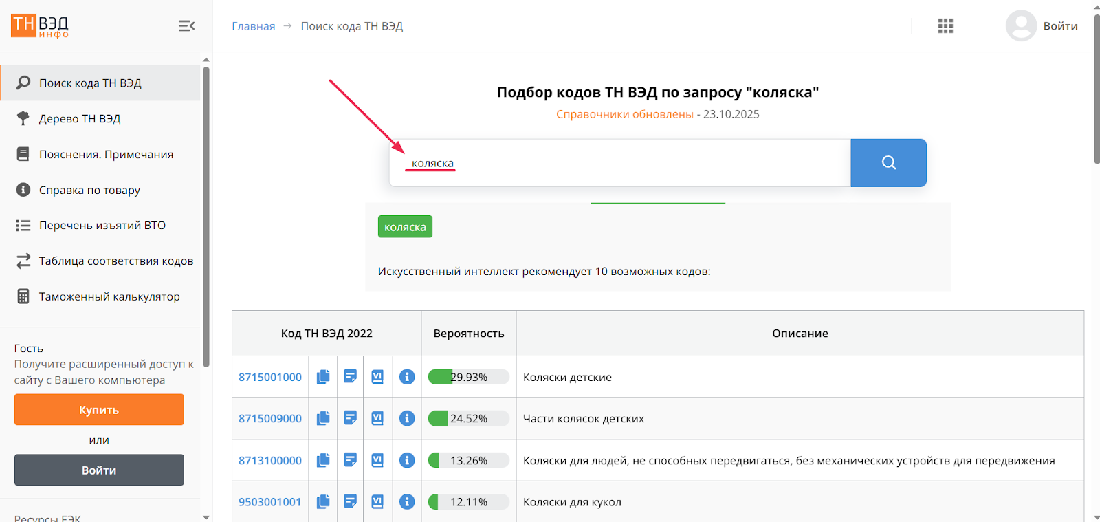 Пример, как искать код ТН ВЭД на сайте ТН ВЭД Инфо. Достаточно ввести название товара в поисковую строку, нажать кнопку «Поиск», и система предложит ниже варианты кодов для товаров с похожим наименованием
