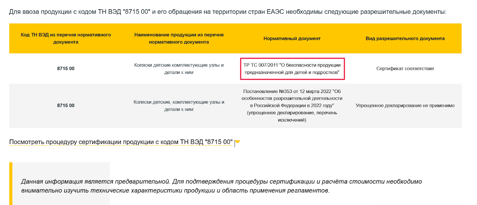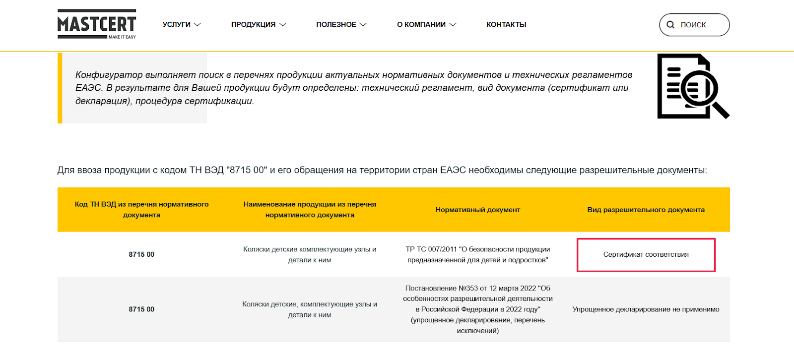 Указав код ТН ВЭД на сайте mastcert.com, вы получите такую же таблицу, что и в шаге 2. Только теперь нас интересует правый столбец, в котором указан вид документа