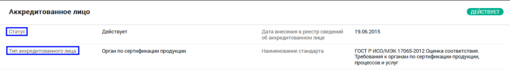 Получитьответ на запрос. Обратите внимание на графу «Статус» и «Тип аккредитованного лица»: