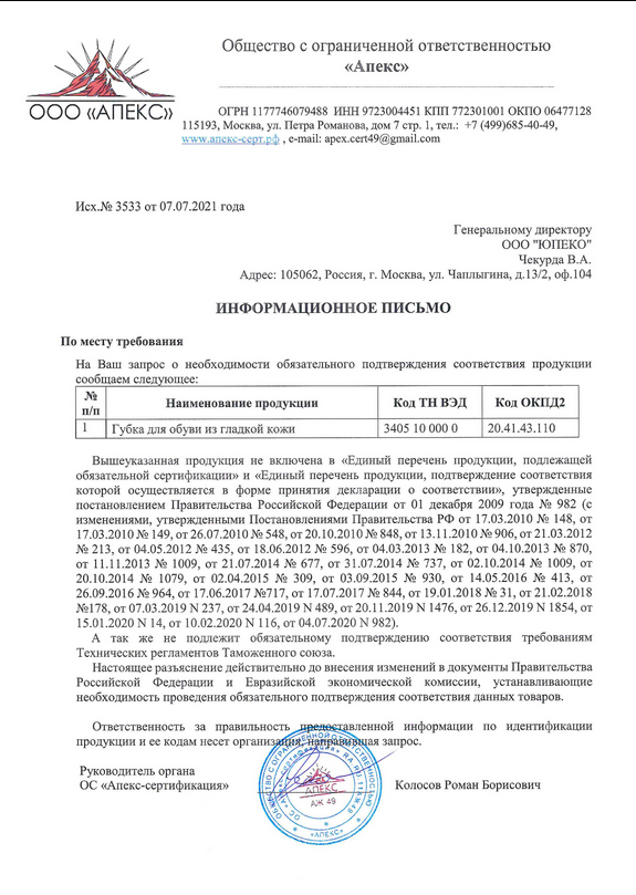 - подтверждение, что на продукцию не нужен сертификат или декларация, с отсылкой на регламенты ТС и перечни Росстандарта;