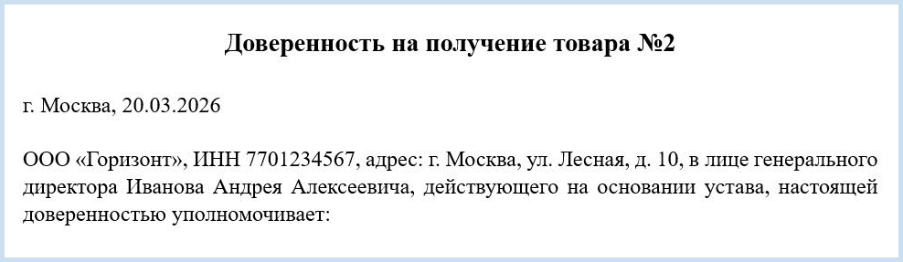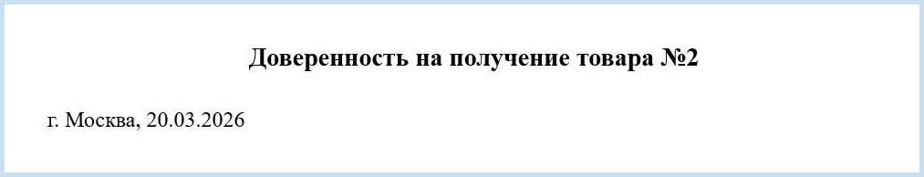 В качестве названия может выступать слово «Доверенность», фраза «Доверенность на получение товара» или порядковый номер документа, например, «Доверенность №3».