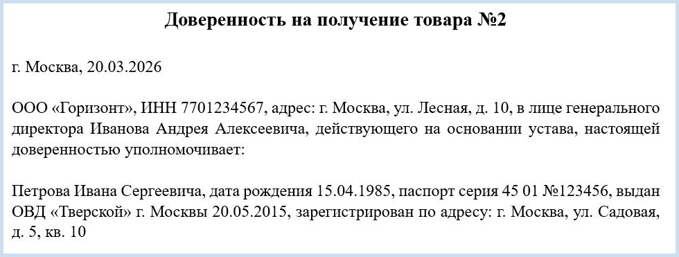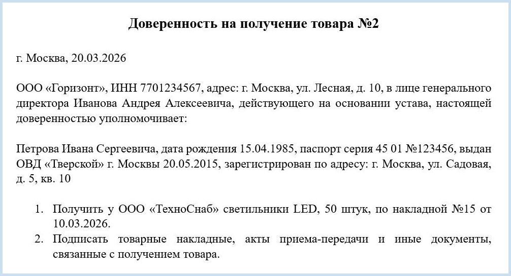 Важно! Представитель может делать только то, что прямо указано в разрешении. Если в документе написано «забрать товар по накладной № 15», он не сможет забрать другую продукцию.