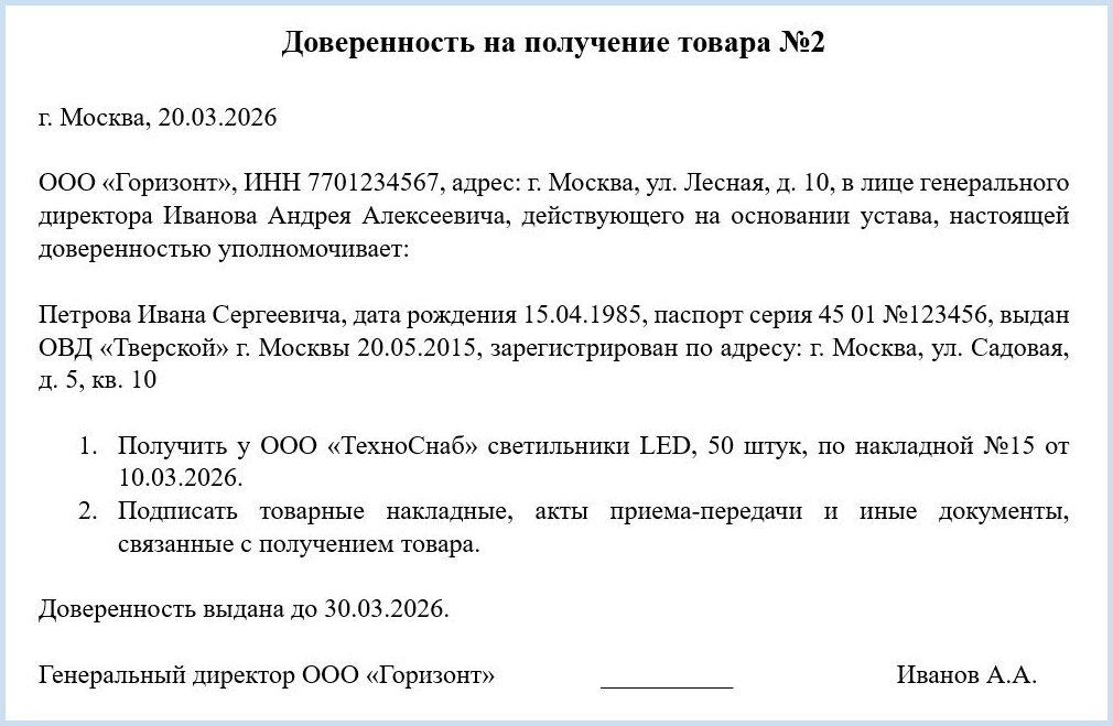 - Полномочия представителя — то есть что именно он имеет право сделать. Например, получить конкретный товар по накладной.