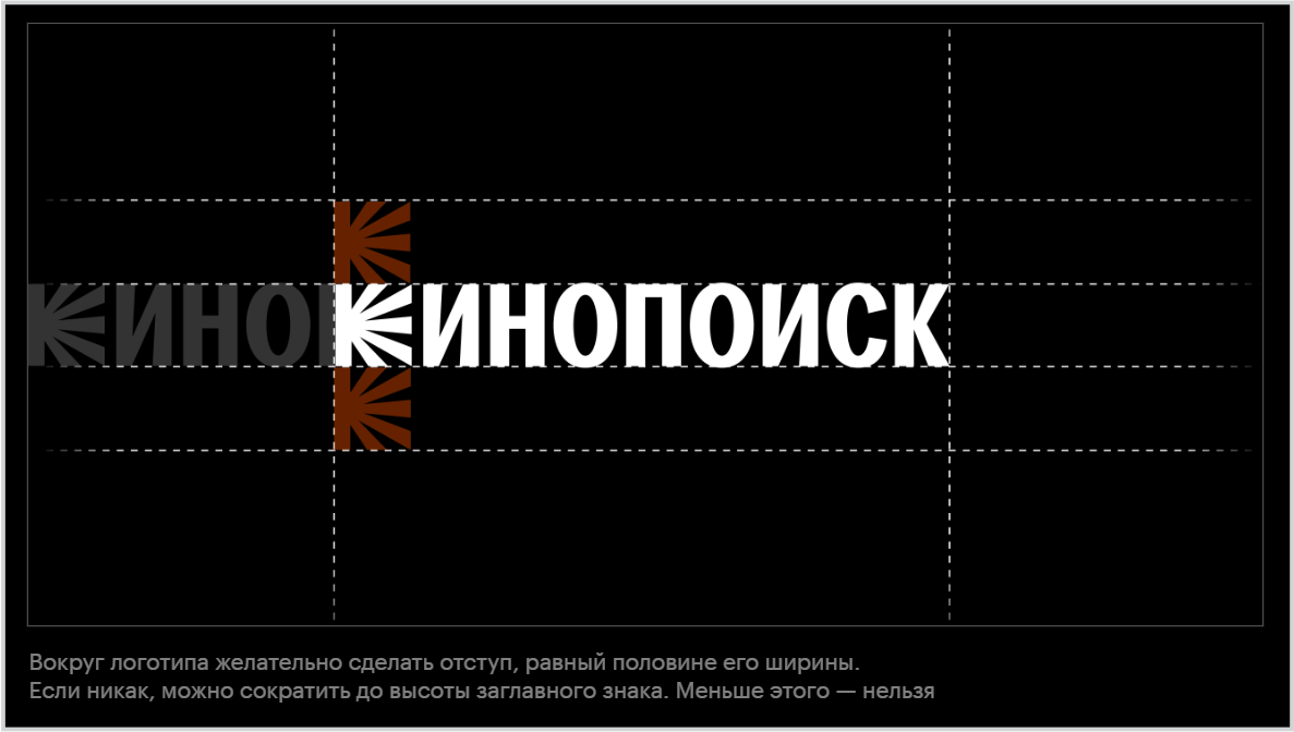 Пример оформления охранной зоны вокруг логотипа «Кинопоиска». Обычно ее размер обозначают в миллиметрах. Либо в единицах, равных ширине самого логотипа