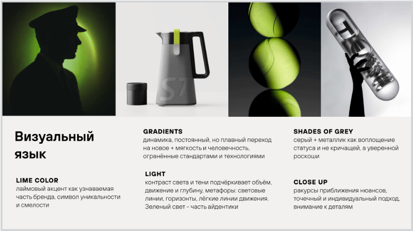 S7 в гайдлайне объясняет, почему визуал именно такой: он отсылает к философии бренда. Это помогает специалистам лучше передавать в работе идеи бренда