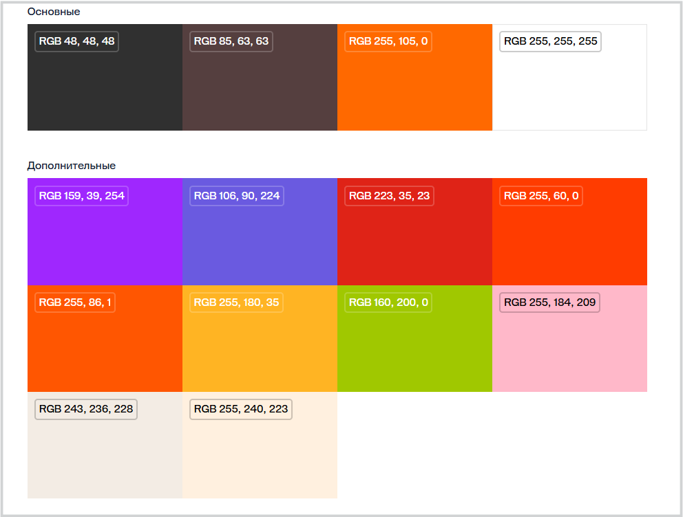 Примеры цветов и их кодов в гайдлайне «Додо Пиццы»
