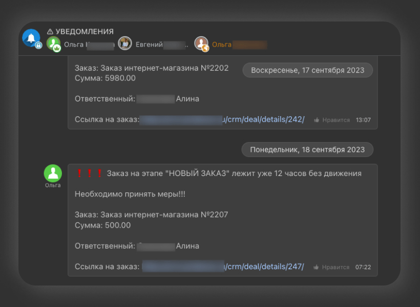 Установить лимит времени на обработку заказа.Например, в «Уют и тепло»,если срок превышен, то руководитель отдела продаж получает уведомление с информацией о заказе в специальном чате. Такие автоматические задачи помогают сотруднику не забывать о важных действиях по заказу и успешно завершать его.