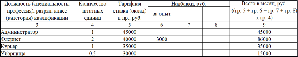 Штатное расписание цветочного салона может выглядеть так: