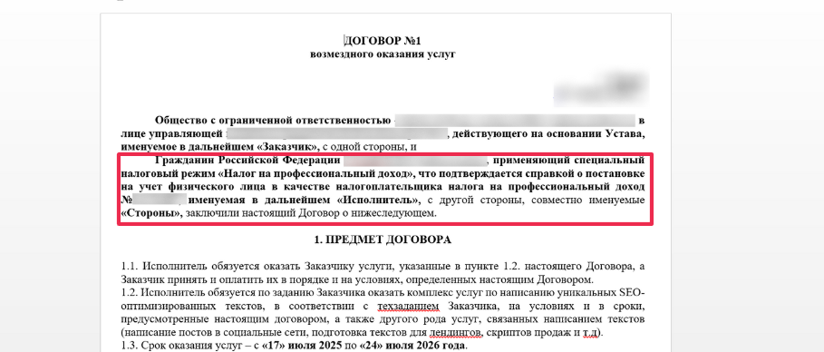 - В преамбуле договор напишите информацию о том, что исполнитель является самозанятым.