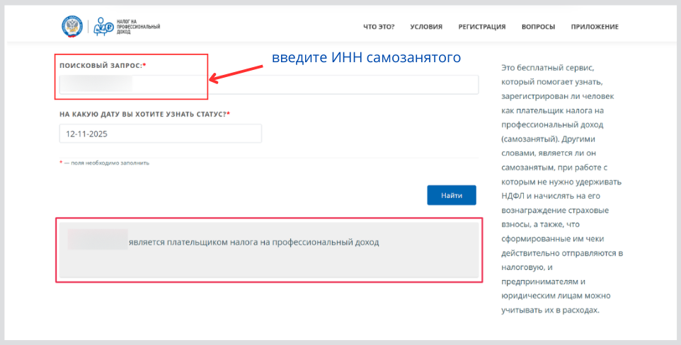 Шаг 2. Зайдите на сайт ФНС в раздел «Проверить статус самозанятого». Введите ИНН исполнителя, сервис покажет, стоит ли он на учете в качестве плательщика НПД.