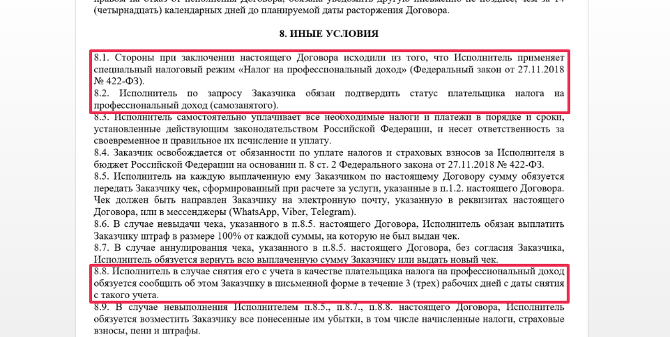 - Закрепите обязанность уведомить заказчика об утрате статуса НПД.