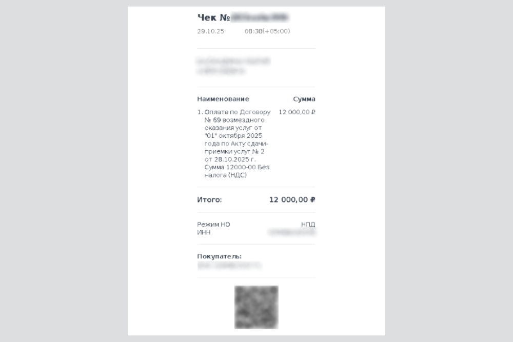 Если самозанятый ошибся в номере вашего ИНН и указал другой, вы не сможете учесть расходы в бухгалтерии. Поэтому каждый раз проверяйте реквизиты сразу после получения чека.