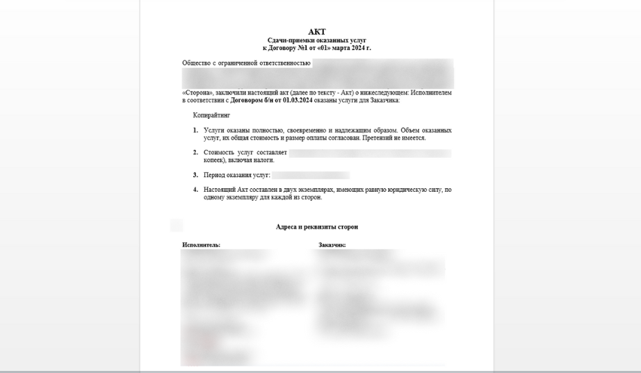 2. Акт(ы) выполненных работ или оказанных услуг. С точки зрения закона акт не всегда является строго обязательным документом для самозанятых, потому что чек НПД уже подтверждает расчет. Однако в судебной и налоговой практике акт подтверждает, что самозанятый выполнил работу, а заказчик ее принял.