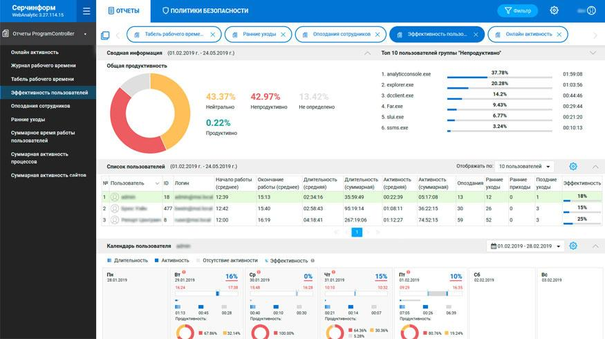 Более продвинутый уровень – использовать для контроля сотрудников DLP-системы. Они как и тайм-трекеры представляют широкую аналитику о том, насколько дисциплинированно и продуктивно работает отдельный человек, отдел или коллектив в целом (см. скриншот ниже). Но проверка продуктивности – лишь небольшая часть функционала DLP-систем, их главное назначение – контроль информационной безопасности. Программы мониторят все каналы связи (от почты до мессенджеров), фиксируют занятость сотрудников за компьютером, пересылку, изменение критичных документов и многое другое. Система оповещает специалиста по безопасности об инцидентах. Так, программы помогают предотвращать сливы данных, подделку документов и другие факты манипуляции с информацией, боковые и откатные схемы и прочие опасные для бизнеса ситуации.