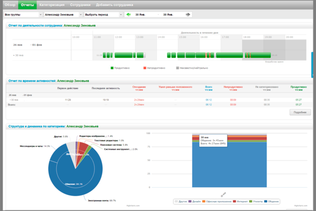 сотрудник N смотрел Youtube 2,5 часа еще час провел ВКонтакте и только 5 потратил продуктивно – в 1С, в «ворде» и телефонных переговорах. Отчеты можно также выстраивать по отделам или по компании в целом.