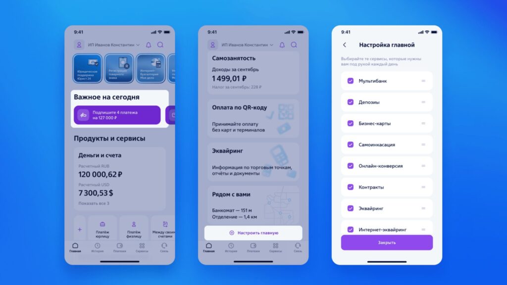 На главной странице в виджете «Важное на сегодня» пользователь также может настроить экран счетов, выбрать часто используемые функции для быстрого доступа и получить персонализированную информацию. Это позволяет отслеживать все актуальные изменения, касающиеся бизнеса, в одном месте.