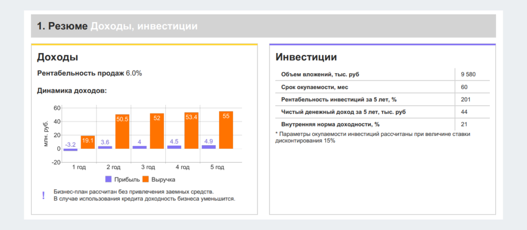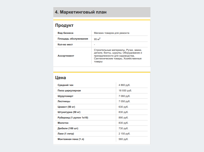 Для примера в Бизнес-навигаторе МСП мы составили бизнес-план на открытие магазина товаров для ремонта в Москве. Площадь помещения — 300 кв. м, площадь обслуживания — 95 кв. м. Сервис составил документ, в котором можно увидеть все основные расчёты.