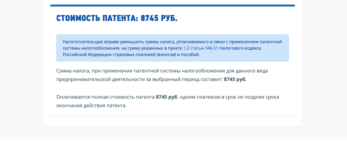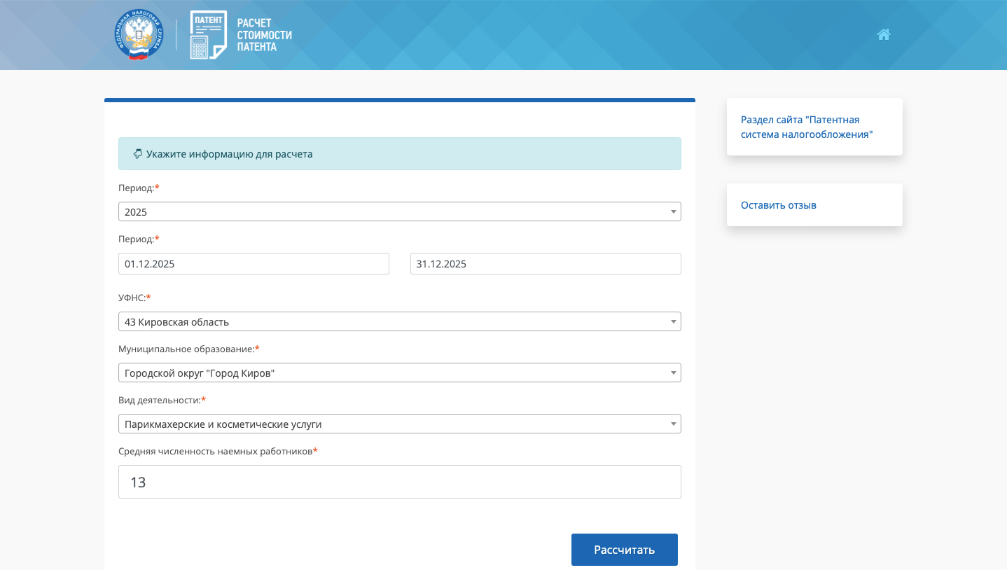 Рассчитать стоимость патента можно онлайн на сайте ФНС.