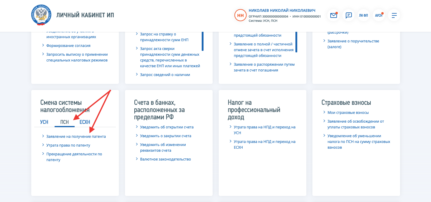 Затем «Смена системы налогообложения» — ПСН —«Заявление на получение патента»