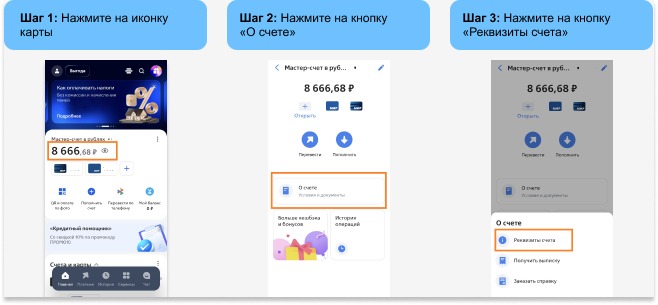 Реквизиты можно получить в мобильном приложении своего банка. Обычно, чтобы увидеть реквизиты, достаточно нажать на иконку банковской карты. Вот как это выглядит в приложении «ВТБ»: