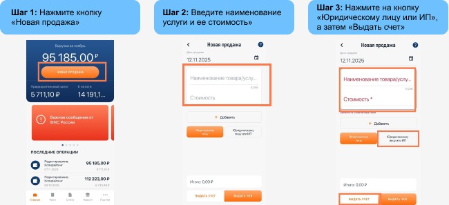 Если вместо чека клиент хочет получить предварительный счет на оплату для бухгалтерии, третий шаг будет выглядеть по-другому. Чтобы выдать счет юридическому лицу или ИП, нажмите кнопку «Юридическому лицу или ИП», а затем «Выдать счет»: