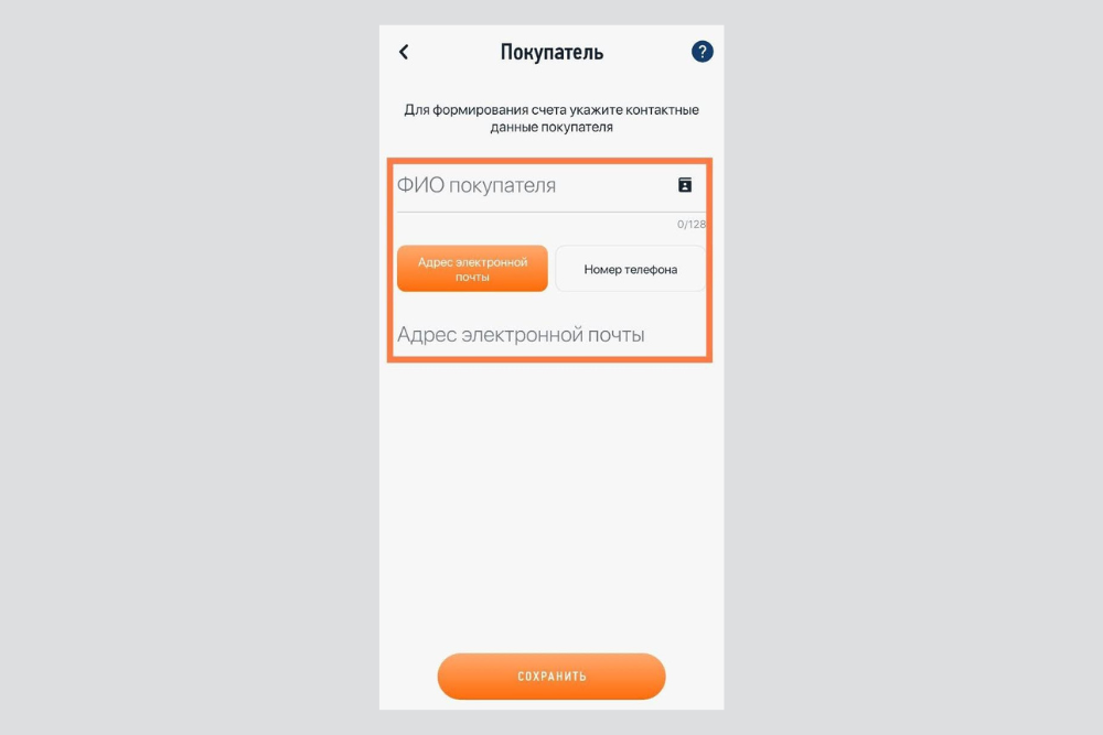Чтобы отправить сформированный счет или чек покупателю, заполните данные о нем. Введите адрес электронной почты или номер телефона, а затем нажмите кнопку «Сохранить»: