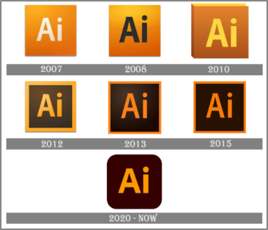 Как менялись тренды, видно на примере логотипа графического редактора Adobe Illustrator: от градиента, рамок, объемных рисунков компания отошла еще пять лет назад
