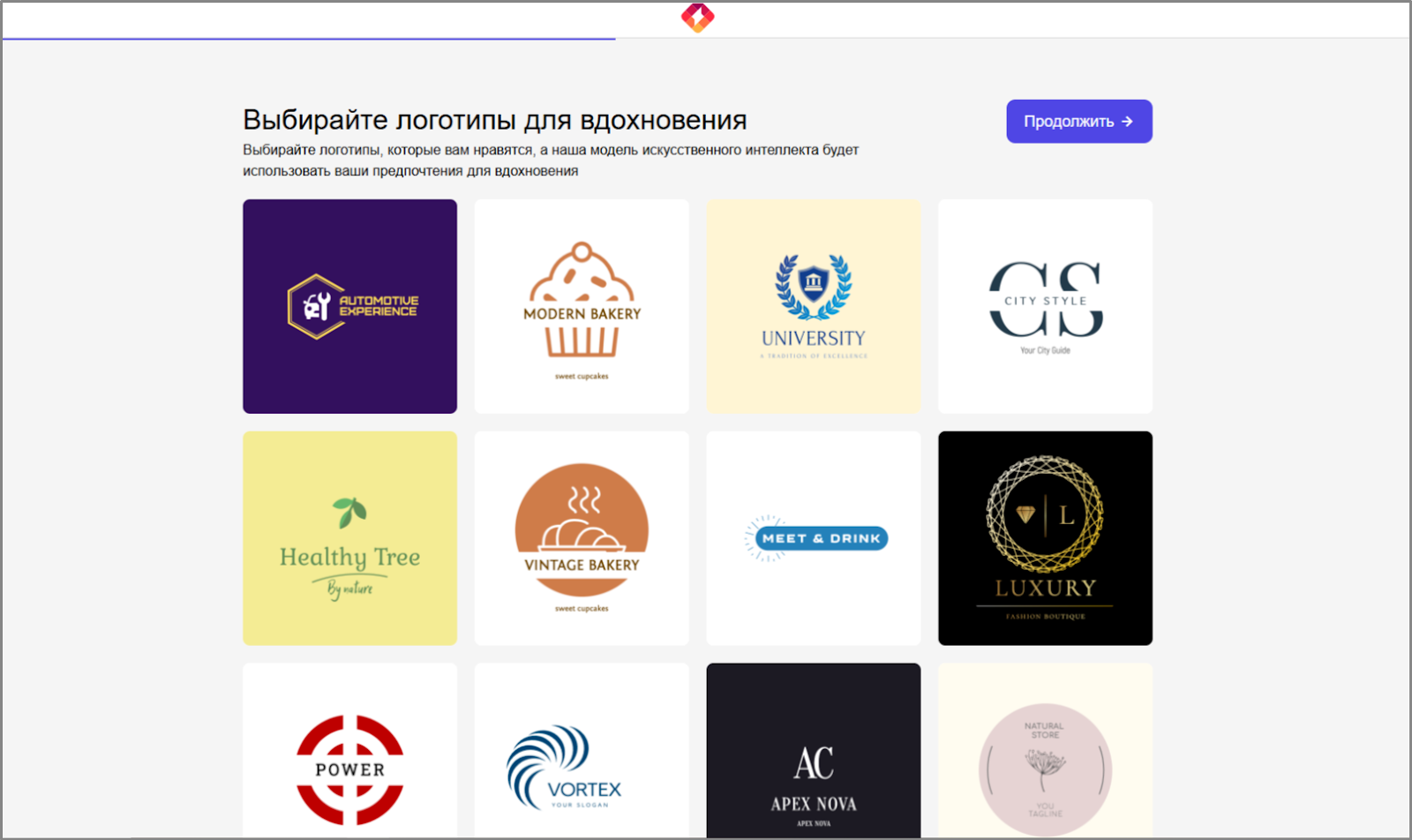 Чтобы определиться со стилем было проще, в программе собраны разные логотипы. Достаточно выбрать несколько тех, которые ИИ возьмет за пример.