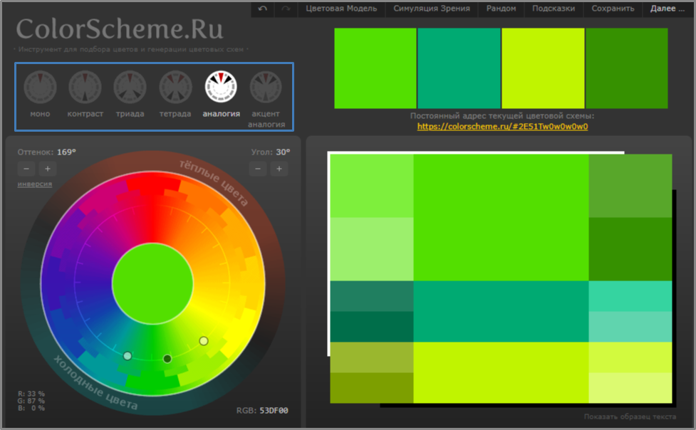 Выберете один из шести вариантов схем и передвигайте точку на круге. Сервис подберет вам удачные сочетания и покажет коды этих цветов в модели RGB.