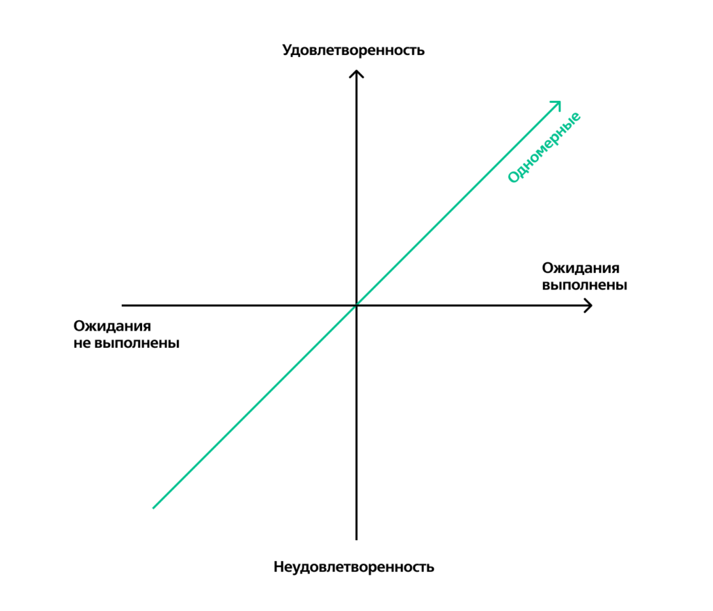 - Линейные. Максимальное удовлетворение — если атрибут имеется, и полная неудовлетворённость, когда его нет. В эту группу попадают характеристики, которые присуще их прямому назначению. Например, наличие педалей и руля на велосипеде, возможность отправлять сообщения на смартфоне.
