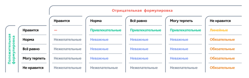 На основании ответов анализа Кано характеристика продукта определяется в одну из категорий. Например, если клиент выбирает ответ, при котором отсутствие определённой функции разочарует его или поставит покупку под вопрос — этот атрибут считается обязательным.