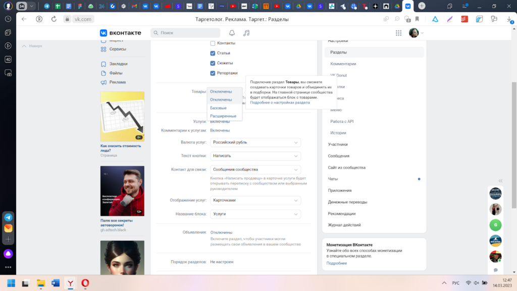 Чтобы создать магазин ВКонтакте внутри Вашего сообщества, нужно перейти в раздел “Управление” — “Настройки” — “Разделы” и включить товары (по умолчанию они отключены). Здесь же сразу выбирается базовый или расширенный вариант.