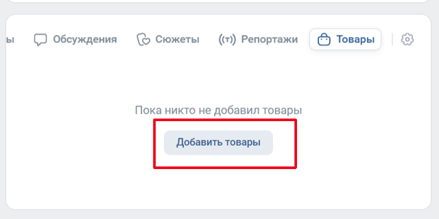 После включения раздела и выбора необходимых настроек, необходимо выйти на основную страницу сообщества, найти раздел “Товары” и добавить карточки (или из настроек магазина для расширенного варианта).