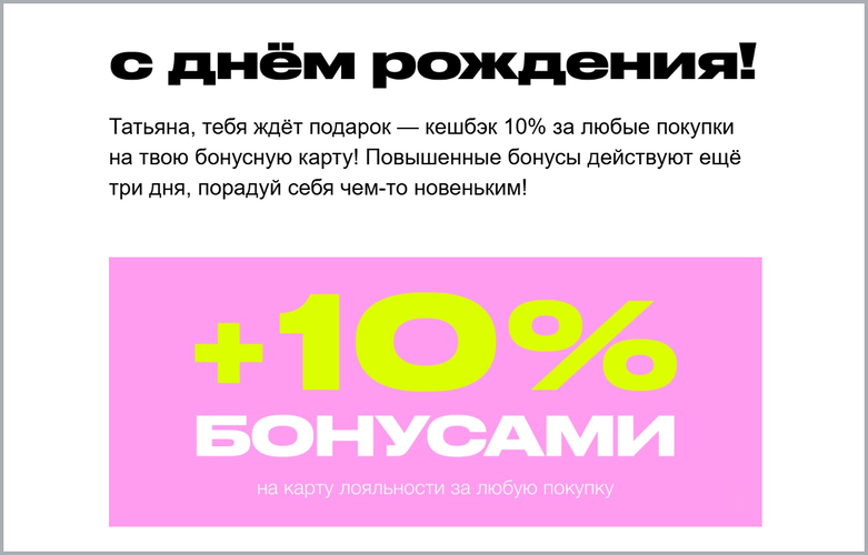 Даже небольшие персонализированные жесты могут повышать средний чек. Например, вместо стандартного поздравления с днём рождения ресторан может предложить бесплатный десерт при заказе ужина, а магазин детских товаров — специальную скидку на игрушки для ребёнка, учитывая его возраст.