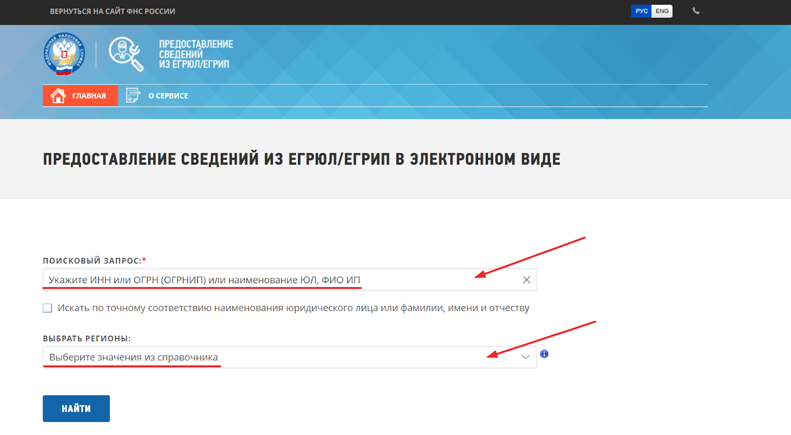 Зайдите на сайт ФНС «Предоставление сведений из ЕГРЮЛ/ЕГРИП в электронном виде». Введите ИНН, ОГРН или название компании, выберите свой регион.