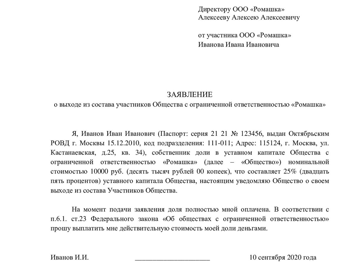 Образец заявления о выходе из состава участников ООО
