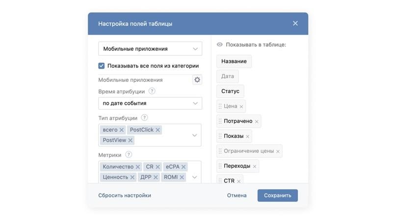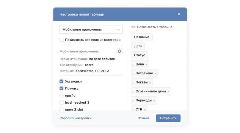 Таблицу со статистикой можно настроить так, чтобы выводить необходимые вам показатели по рекламе мобильного приложения. Для этого: