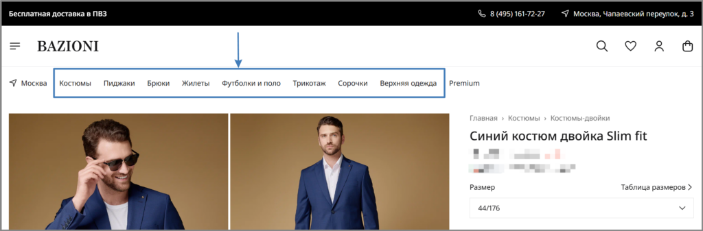Онлайн-магазин мужской одежды разместил категории товаров в главном меню сайта. Даже если пользователь будет находиться на других страницах сайта, в верхней части экрана он будет видеть это меню.