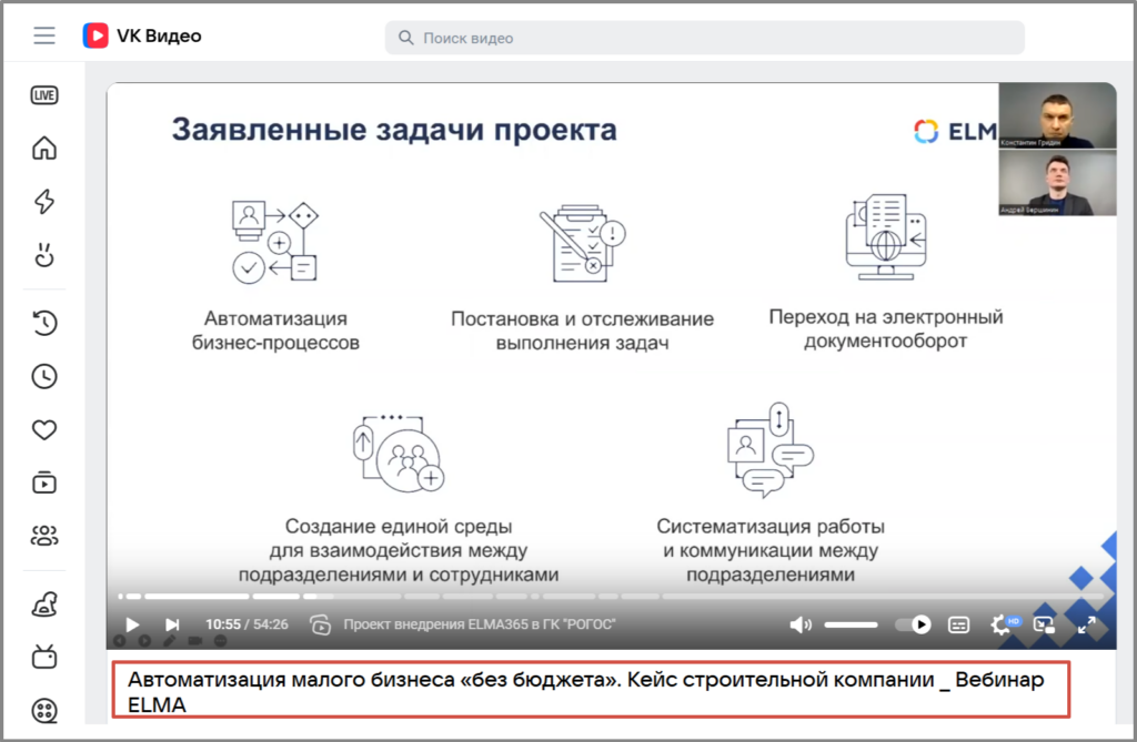 - Видеохостинги. Например, RUTUBE или «VK Видео». На них можно создать собственный канал и размещать кейсы в видеоформате. Видео помогает передавать эмоции, визуализировать данные и удерживать внимание аудитории. Если у компании нет ресурсов на профессиональную съёмку и монтаж, можно использовать более простые форматы. Например, можно записать разбор кейса в формате вебинара или слайд-шоу с озвучкой.