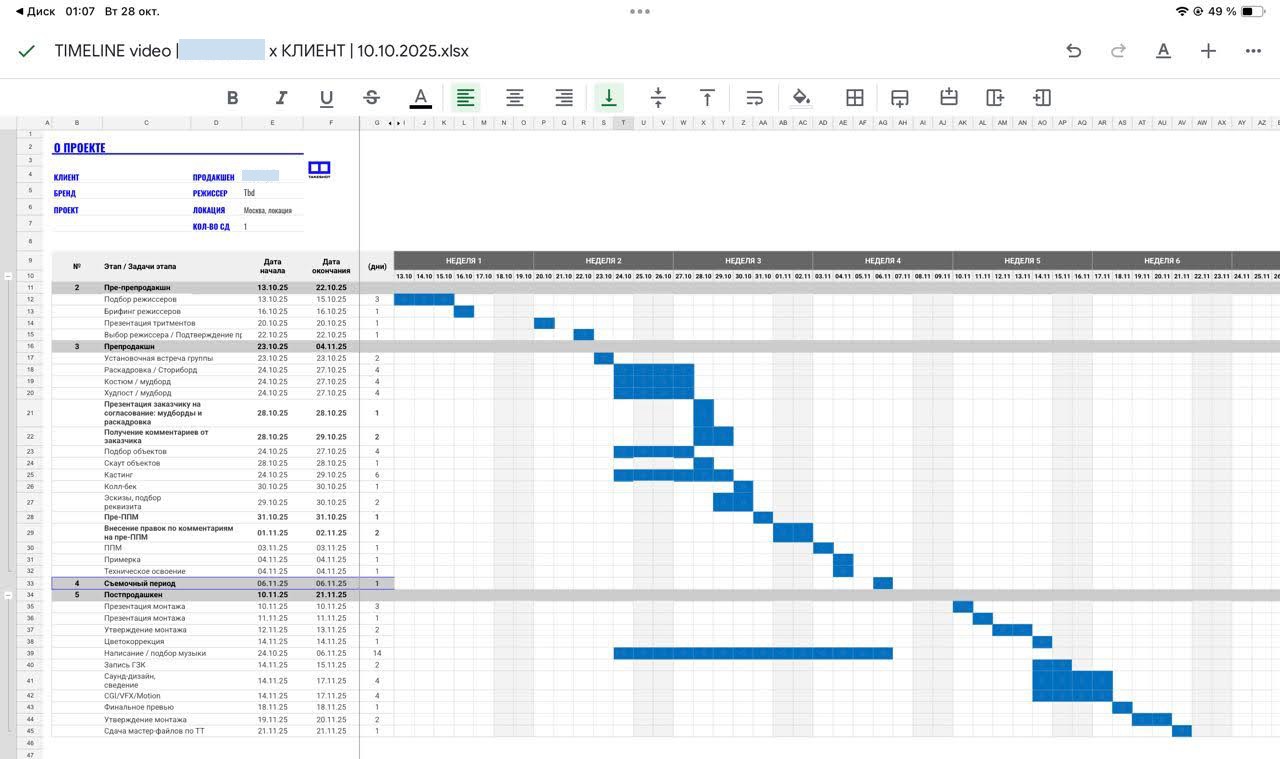 В форме тайминга установили автоматическую заливку ячеек согласно количеству дней, которые выделены на каждый этап работ. Также настроили взаимосвязи между этапами. Теперь тайминг пересчитывается автоматически в зависимости от изменения сроков проекта.