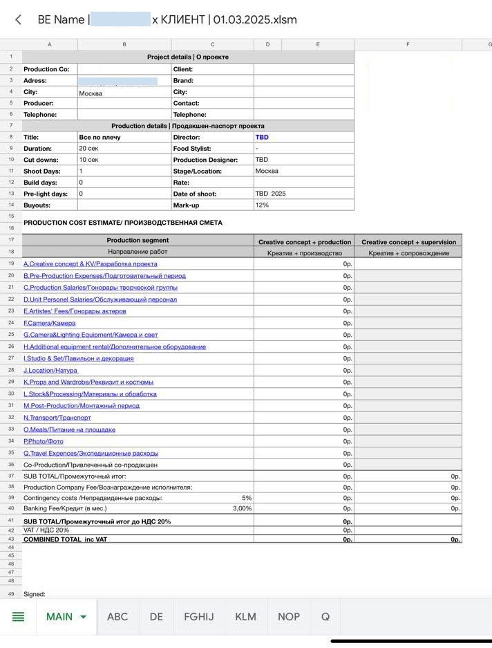 В смете нужно заполнить только главный лист: например, проставить количество задействованных сотрудников, расходы на художественное оформление, костюмы, технику. Эти цифры автоматически появятся на остальных страницах